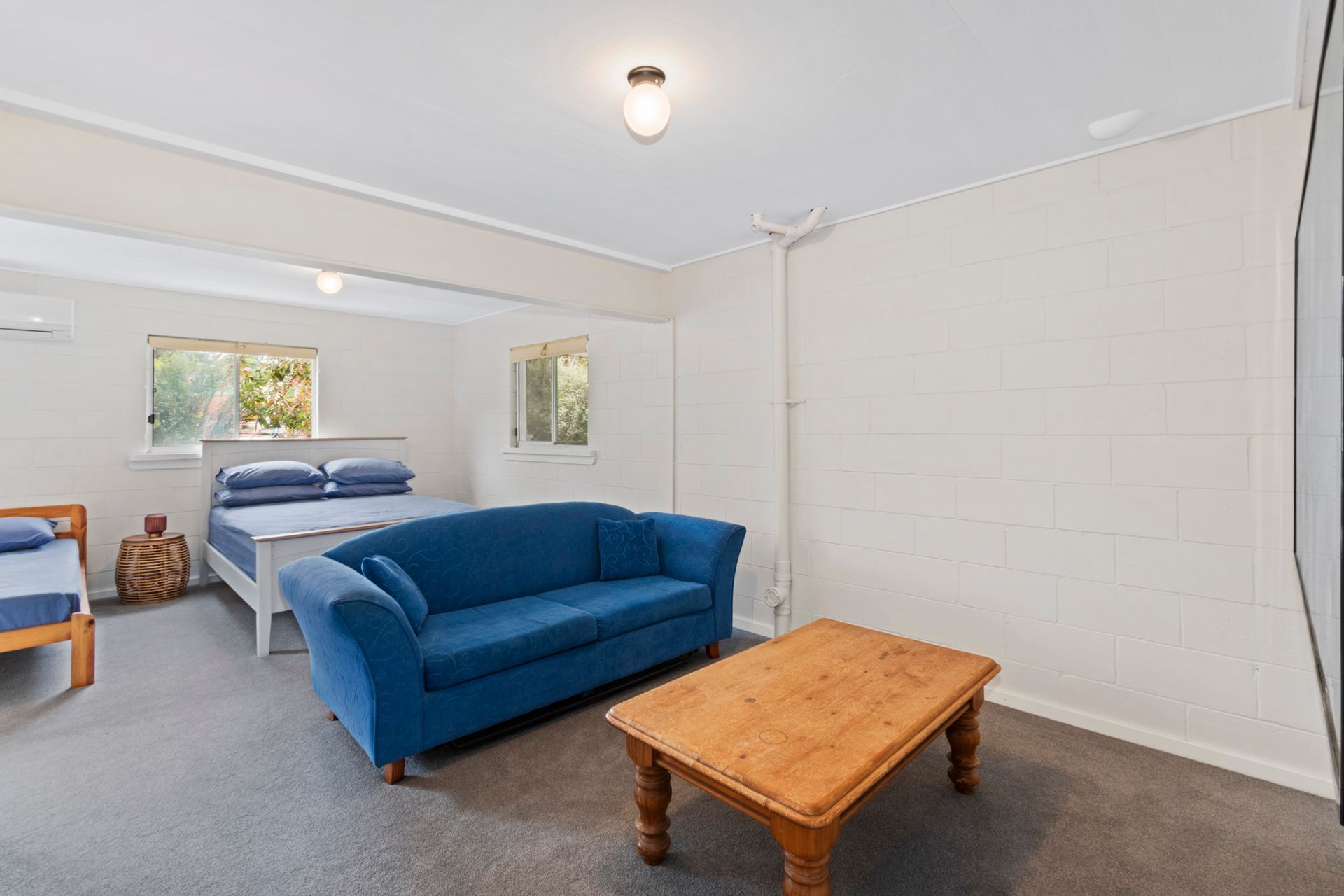 Downstairs (External Access): A large private room with a queen bed, two single beds, its own lounge area, smart TV and an additional shower and toilet, kitchenette and bar fridge.
