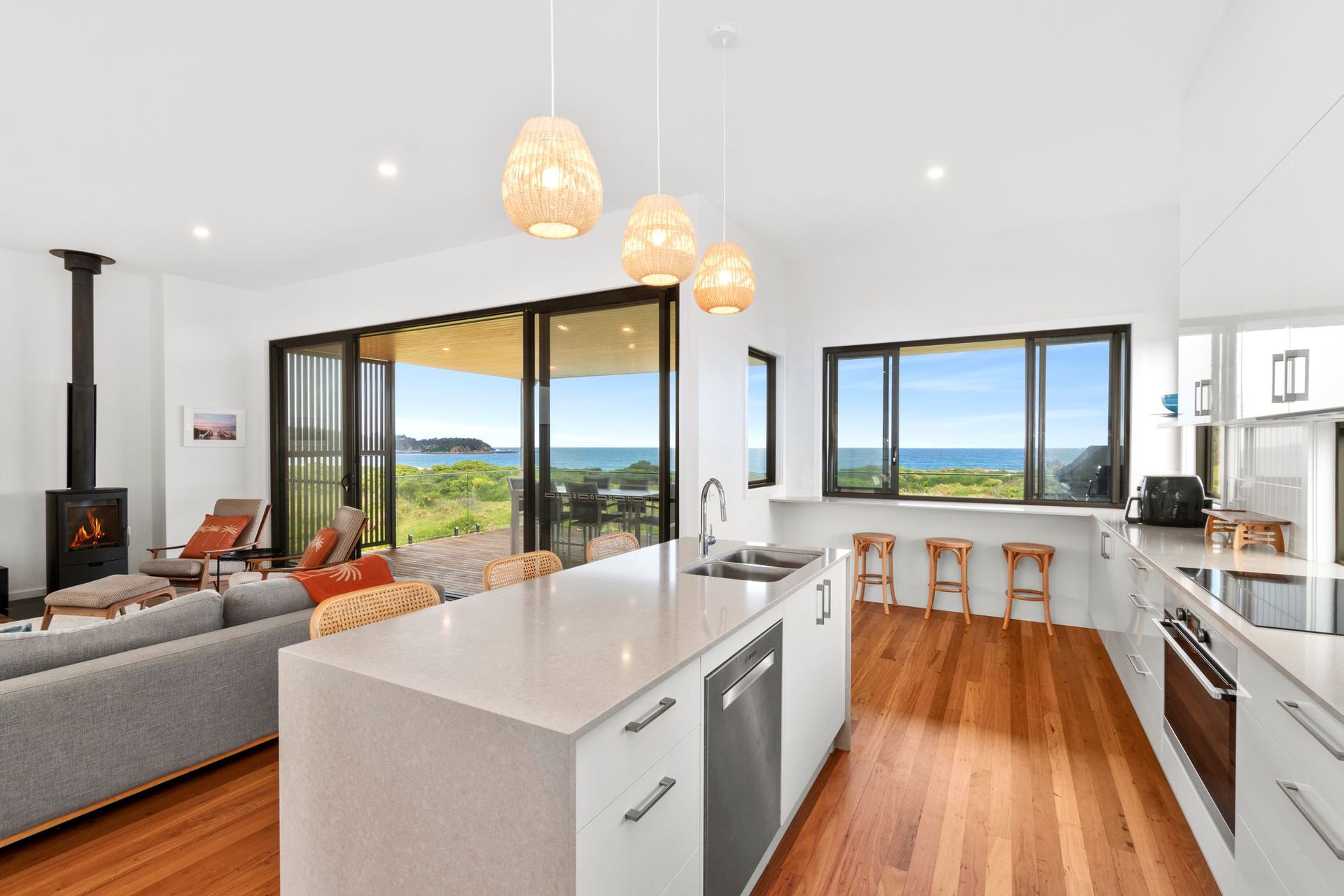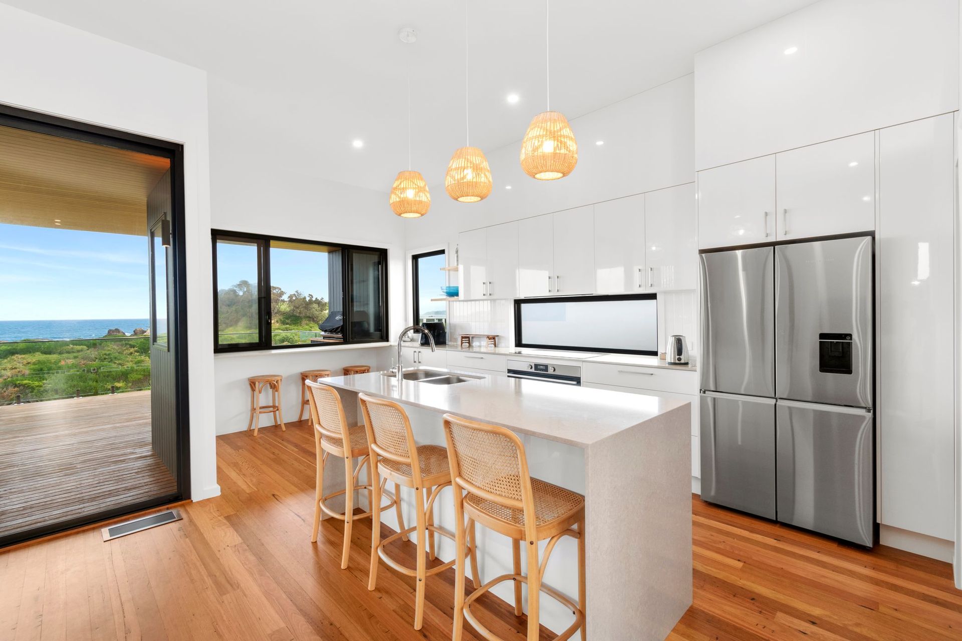 Upstairs the fully equipped kitchen boasts modern appliances and ample counter space, allowing you to prepare delicious meals during your stay. Enjoy your culinary creations at the dining table or the huge deck, where you can savor your feast while enjoying the mesmerizing ocean vistas.