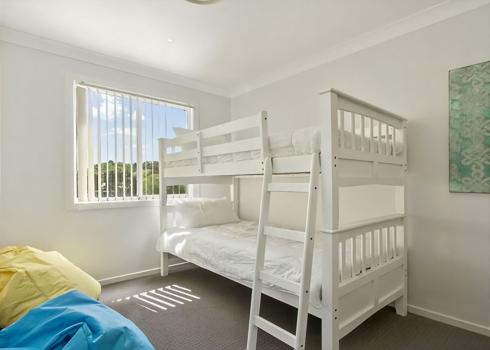 Layout: Downstairs has a single bed and another bedroom along with a laundry, and kids area. Upstairs houses another 3 bedrooms, a kitchen and the living/dining area, a huge lounge room. There's a good sized television to enjoy a lazy movie or two, and a huge amount of room on the back deck.