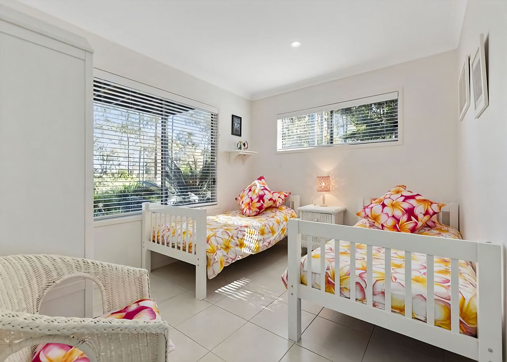 The bedrooms are all located downstairs to enjoy the cool summer breezes. There are 3 bedrooms (1 x queen, 1 x double and 2 x singles) and a full bathroom with tub.