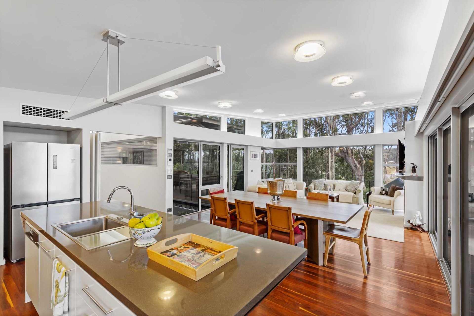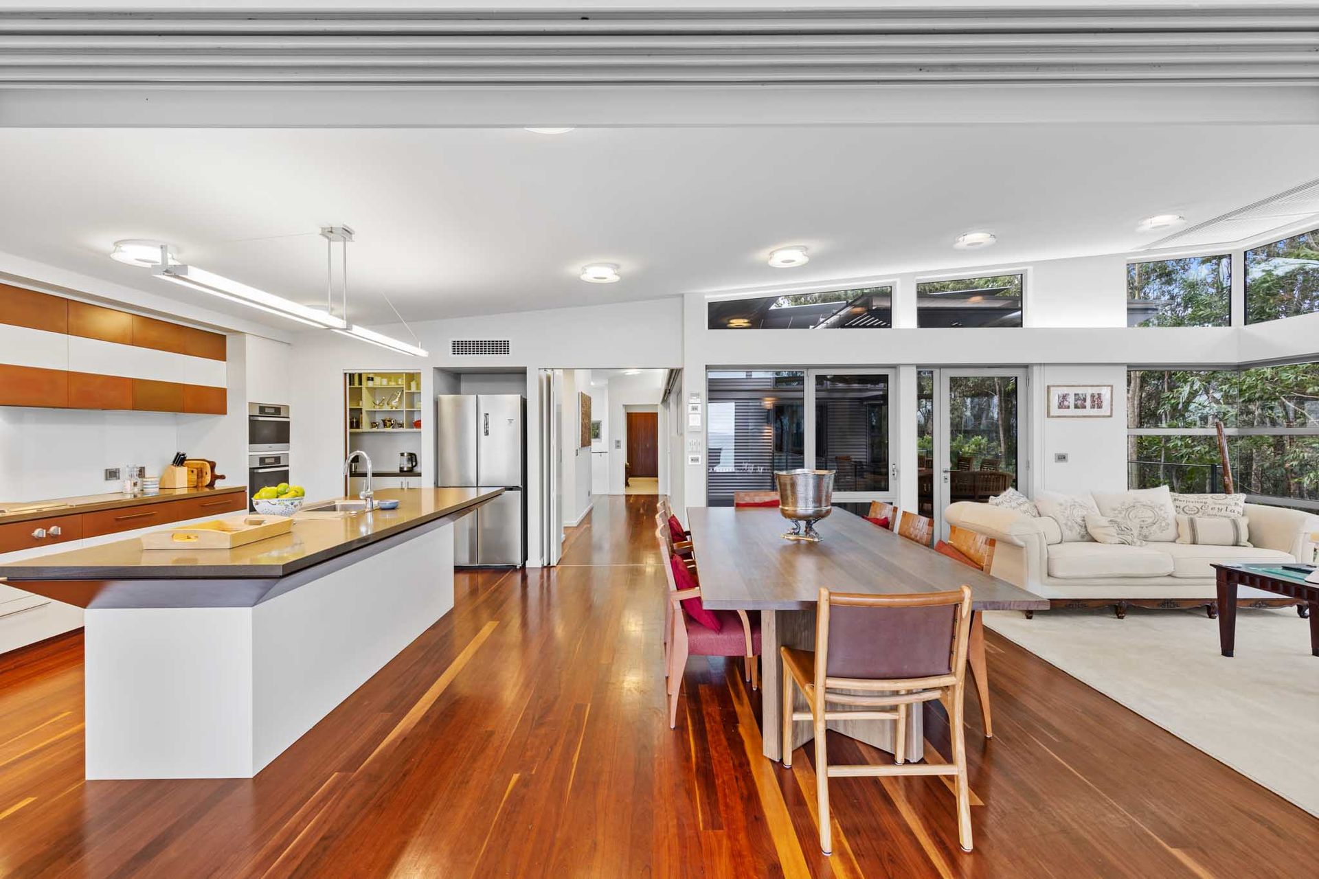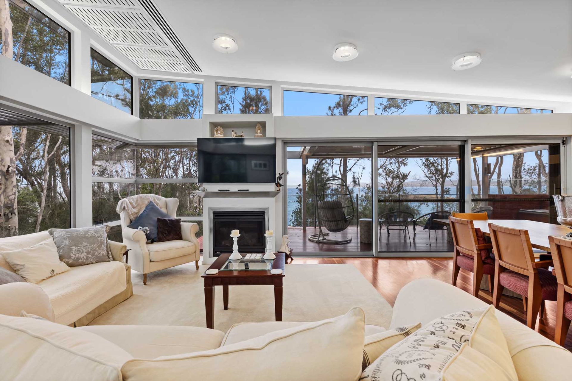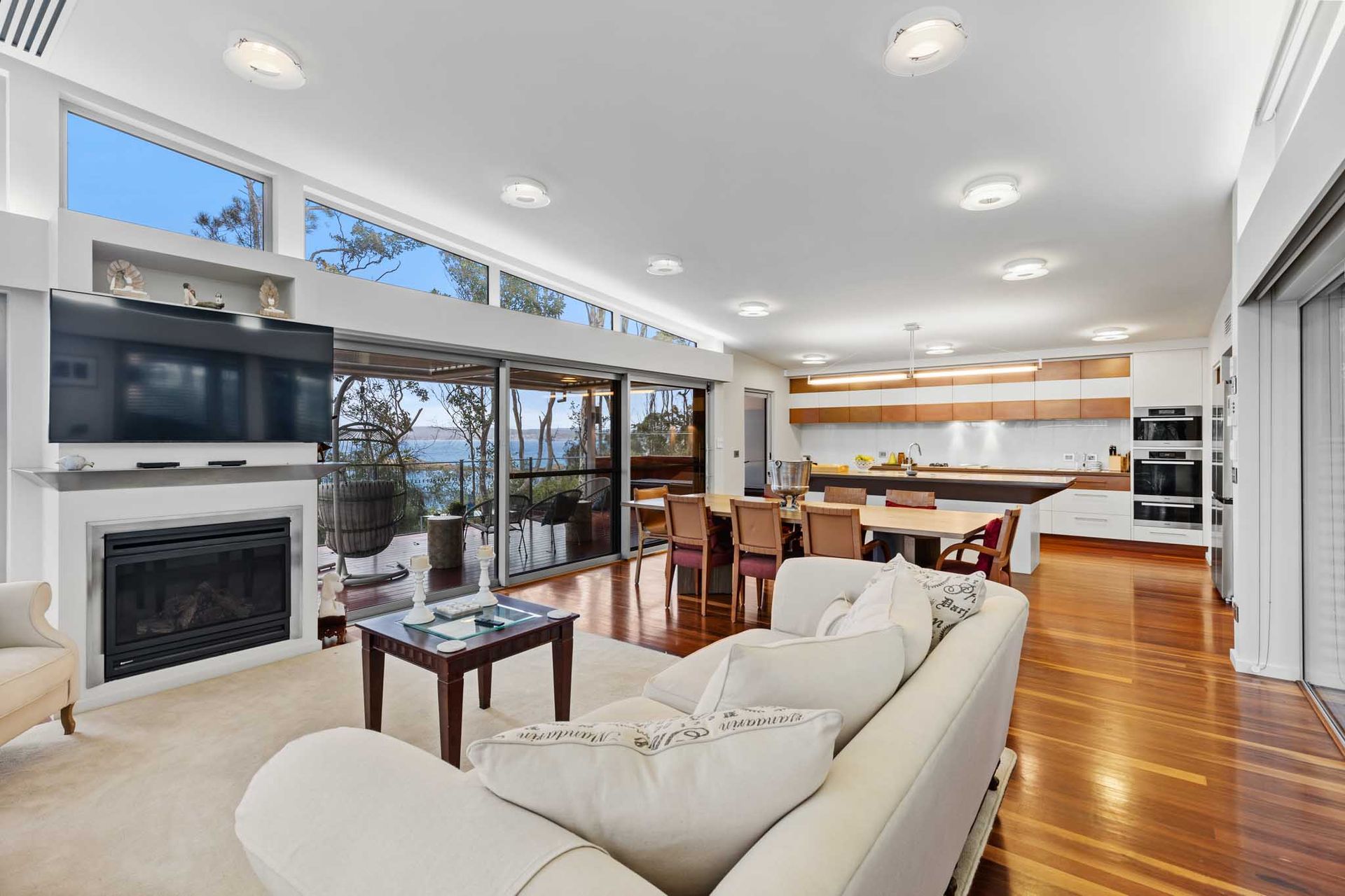 Expansive open-plan living with floor-to-ceiling glass framing the coastline