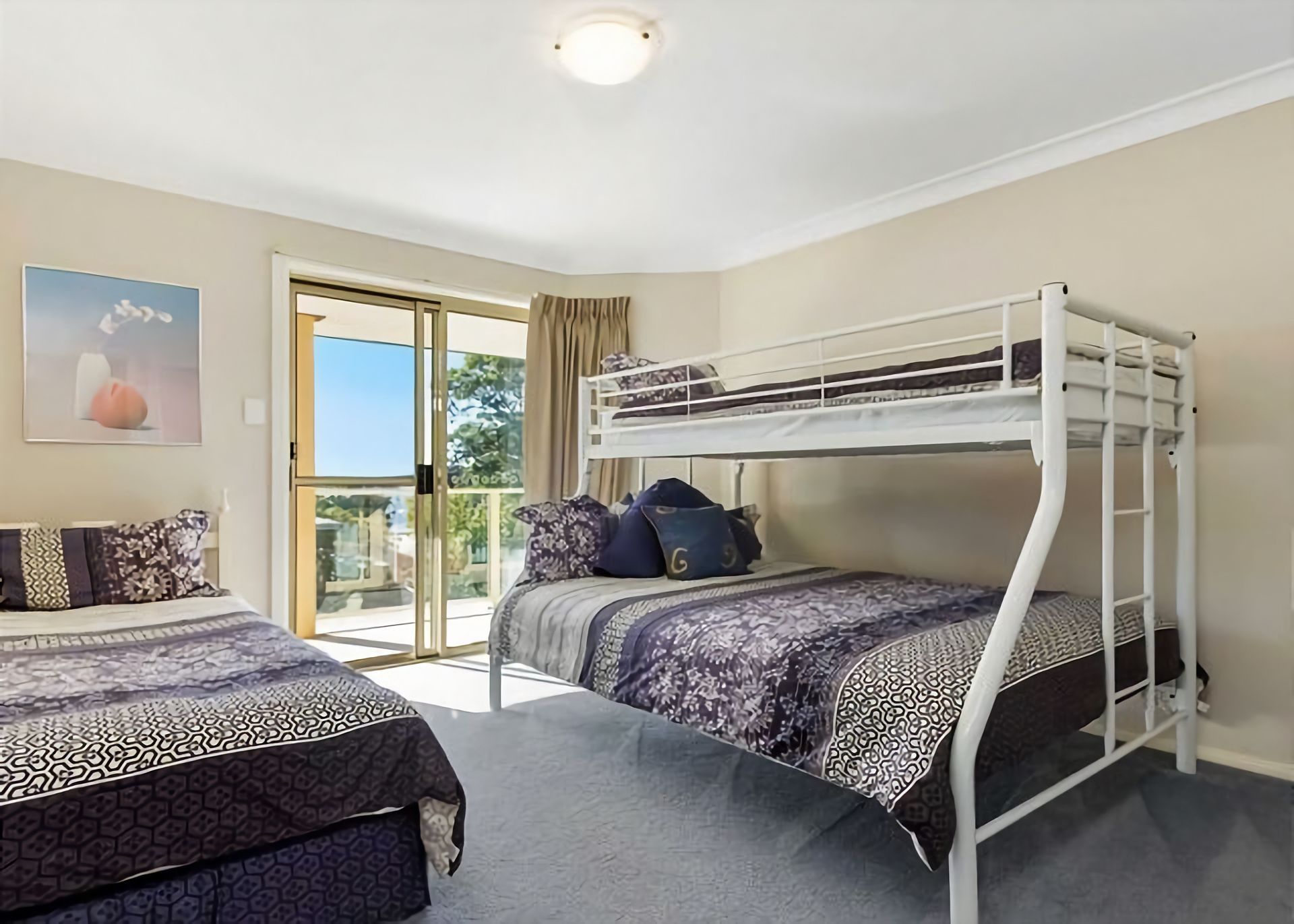 Bedroom 3 has tri-bunks (single and double) and a king single bed.