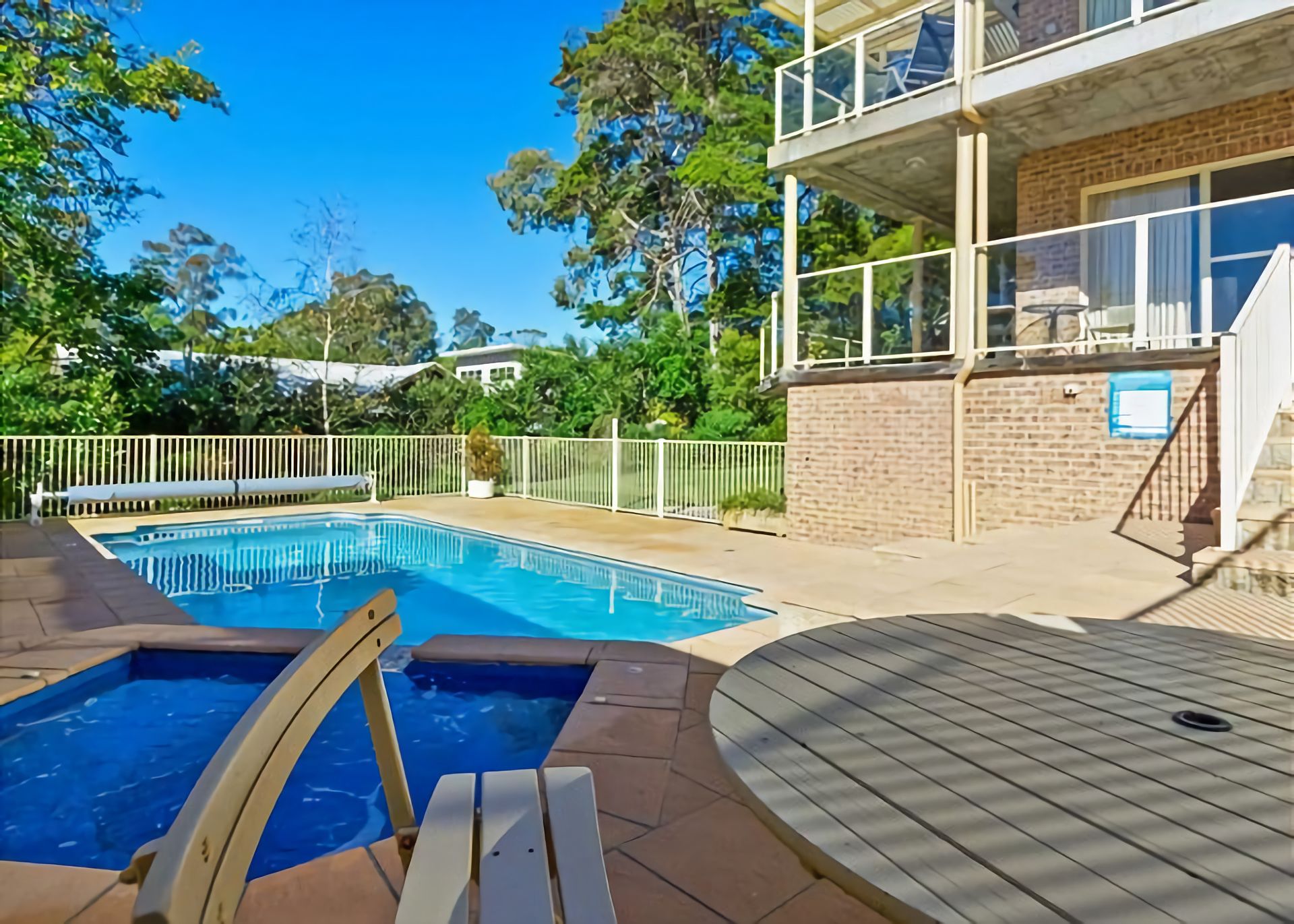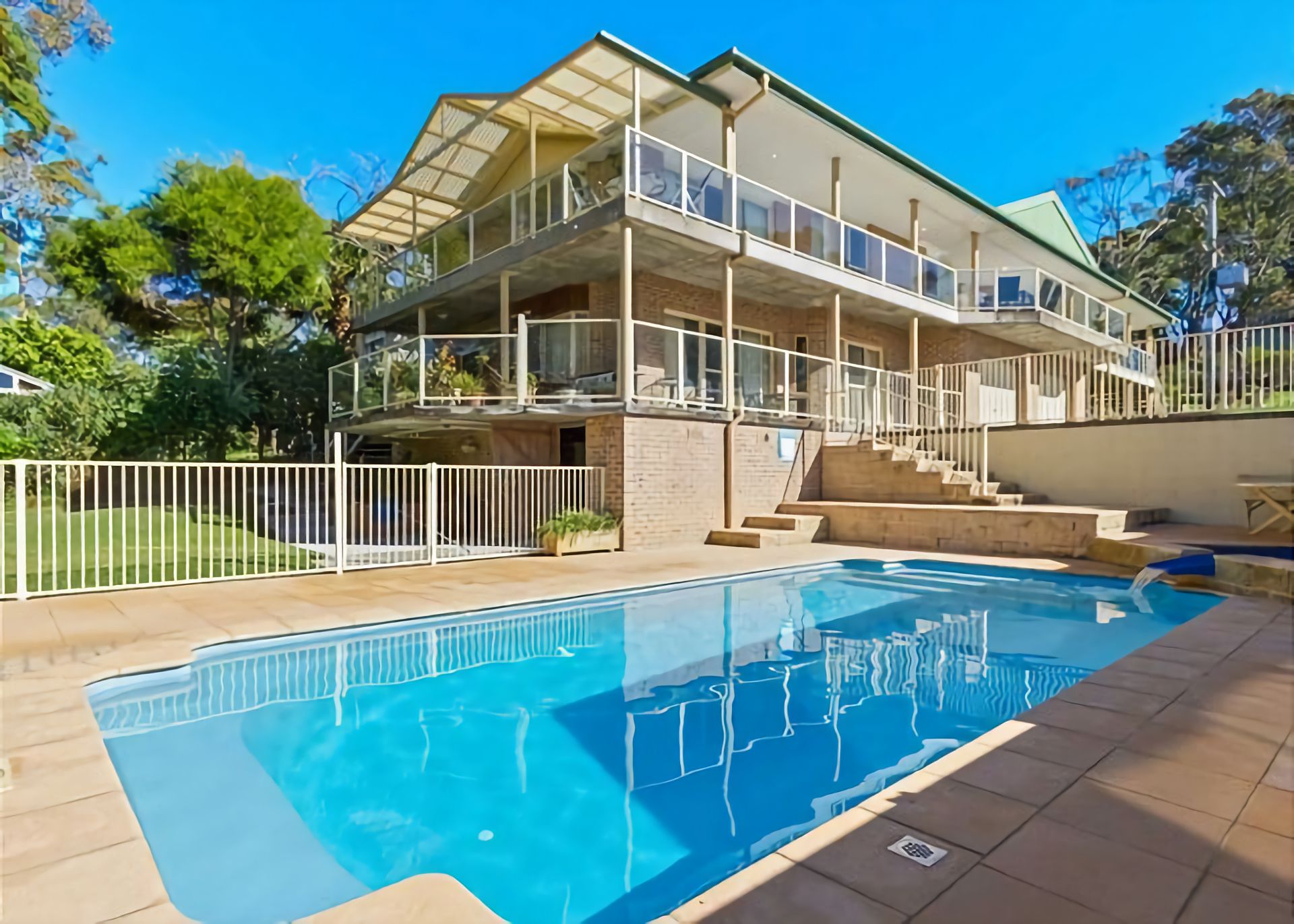 Outside: There is a large wrap around deck that goes the length of the house and overlooks the pool. The pool is not heated. The pool is just beautiful and fully fenced separately to the yard, so you can sit up on the balcony while you watch the kids swim below.