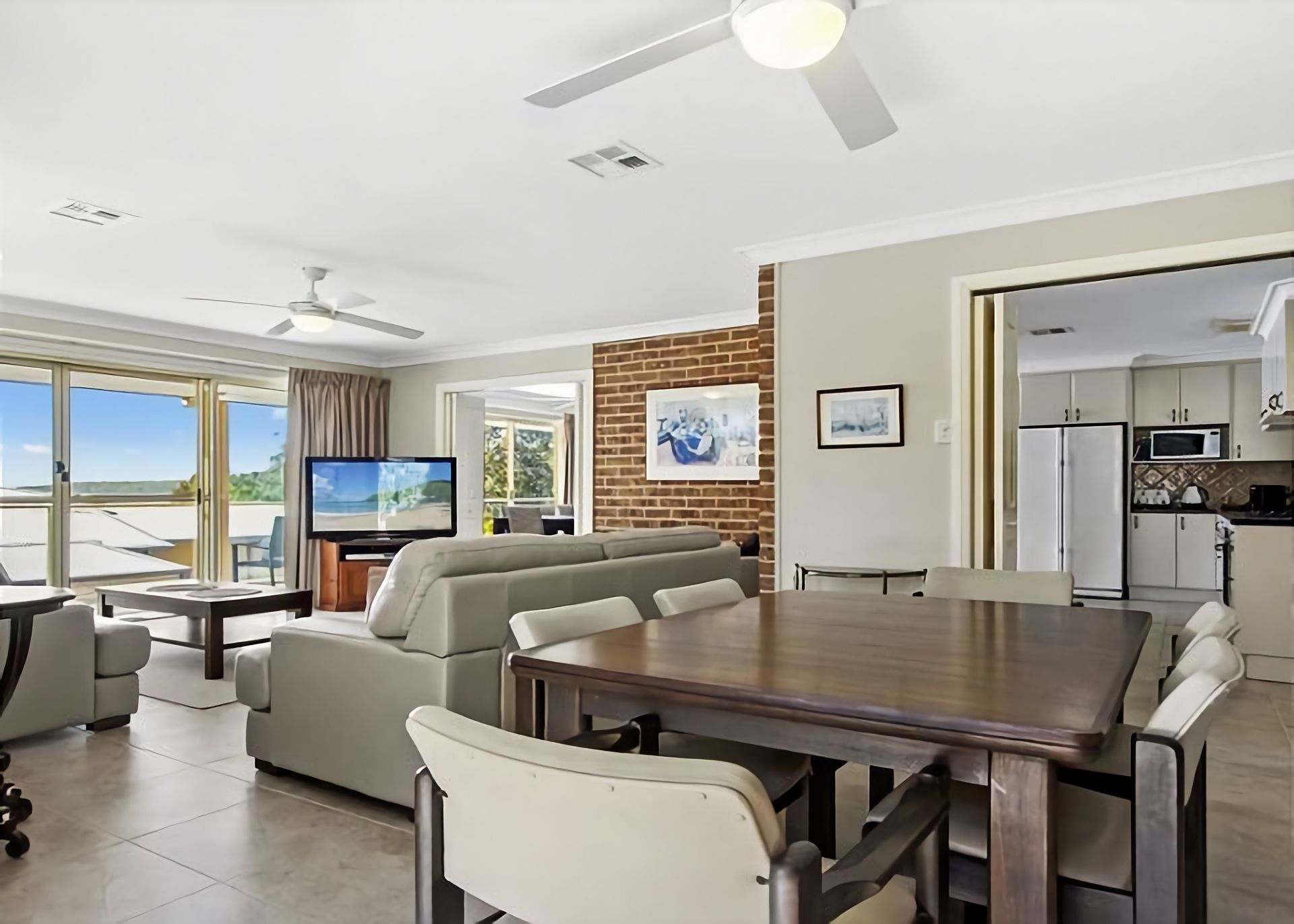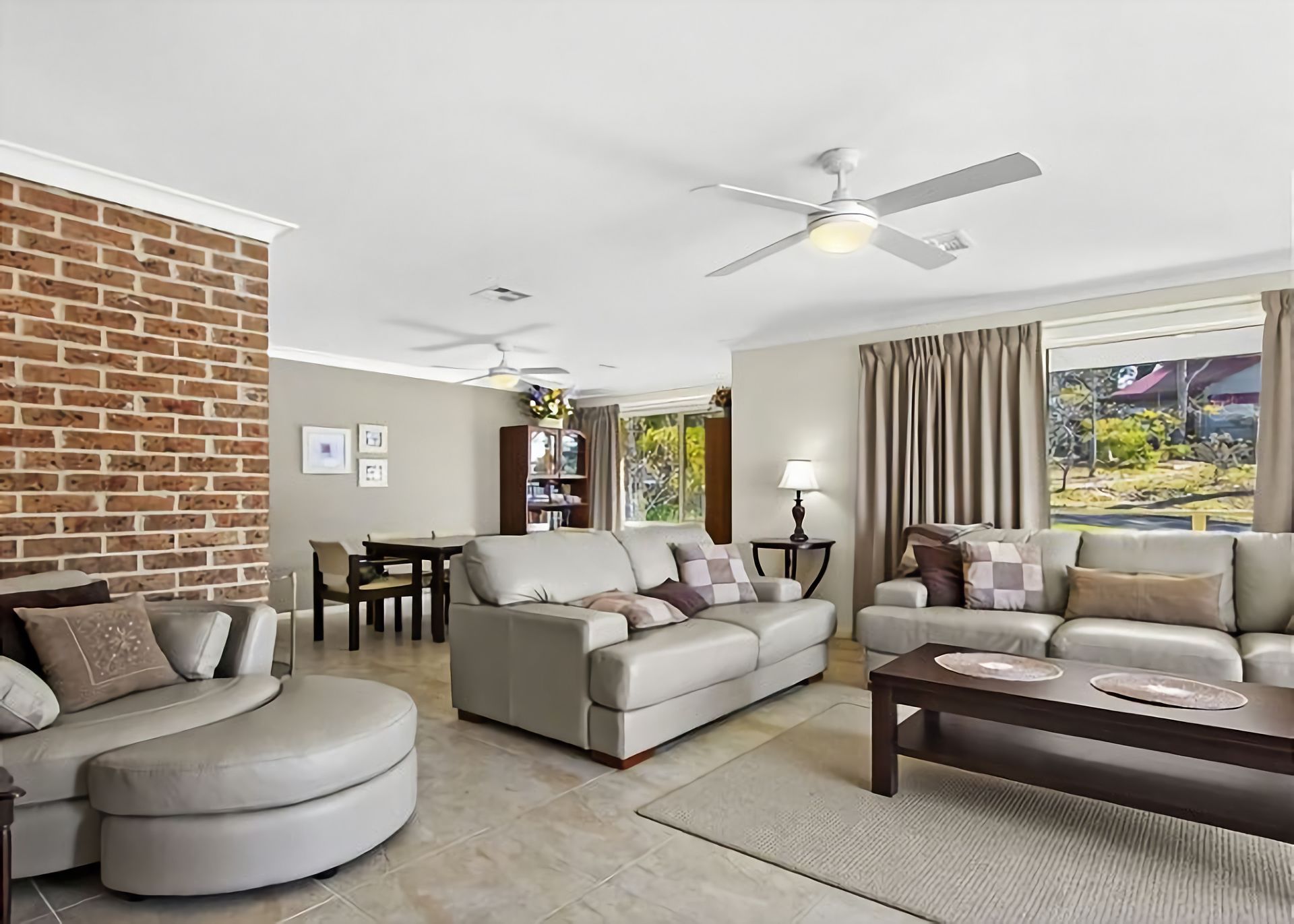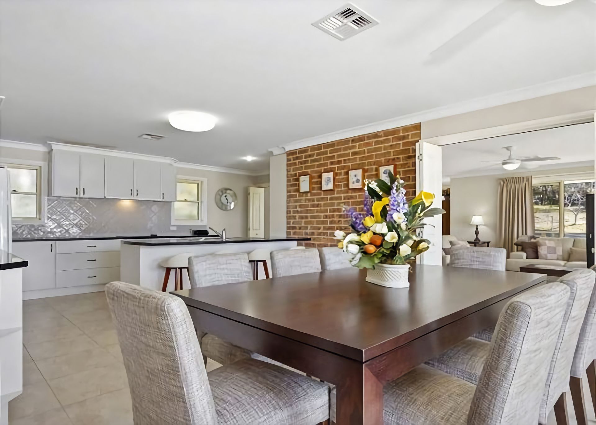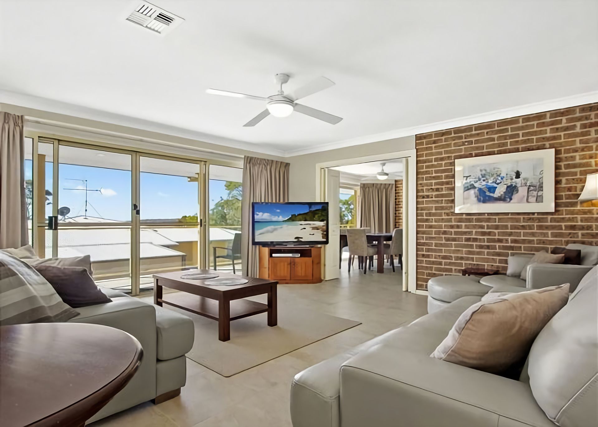 Living: An open plan lounge dining room with a TV, DVD, and ceiling fans. The ducted heating and cooling upstairs, means that you will be able to escape the heat in summer and keep toasty warm in winter.