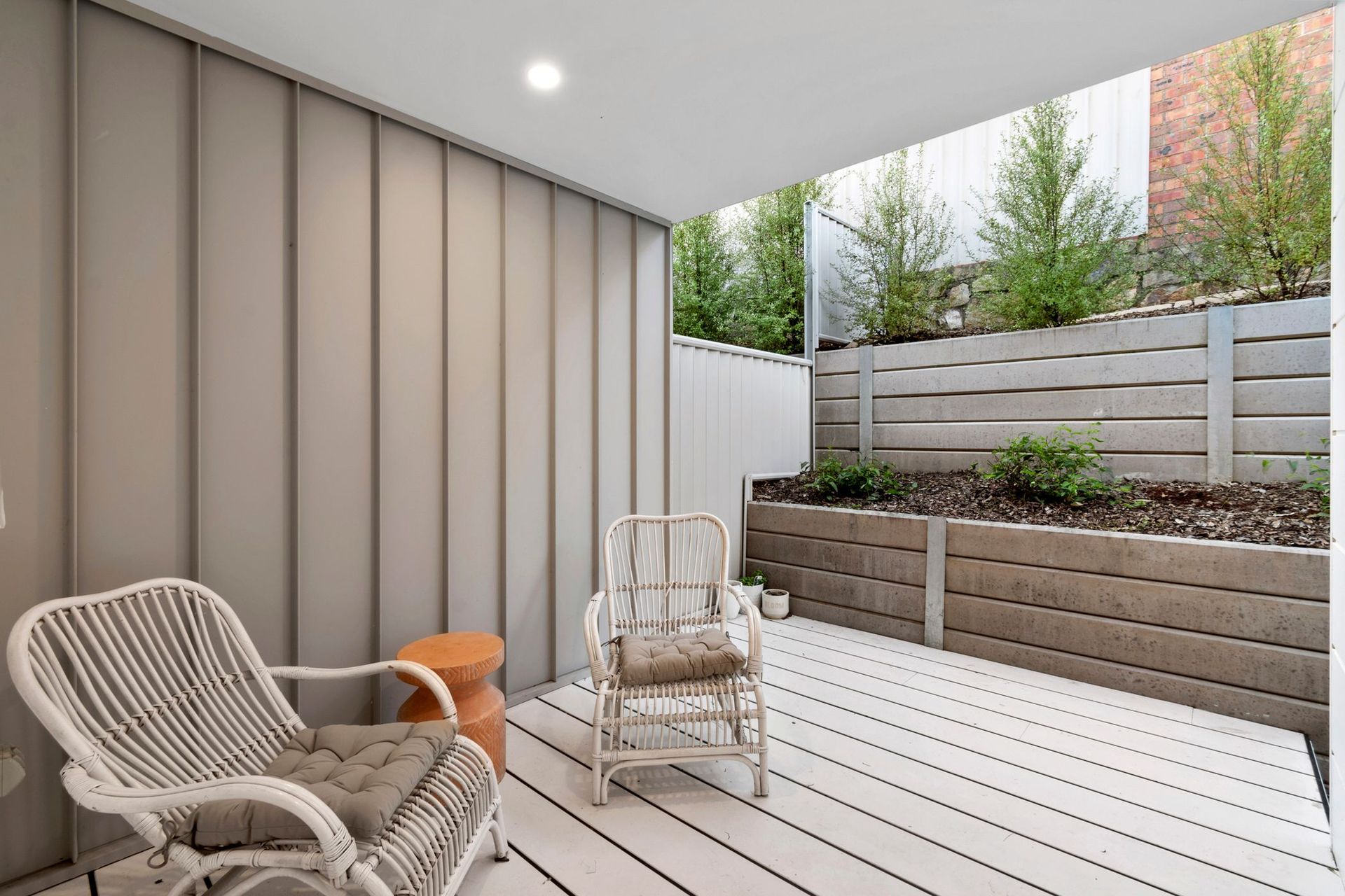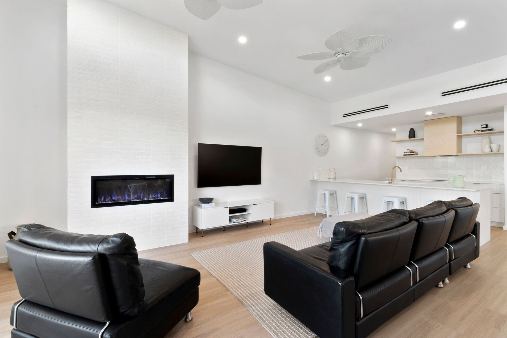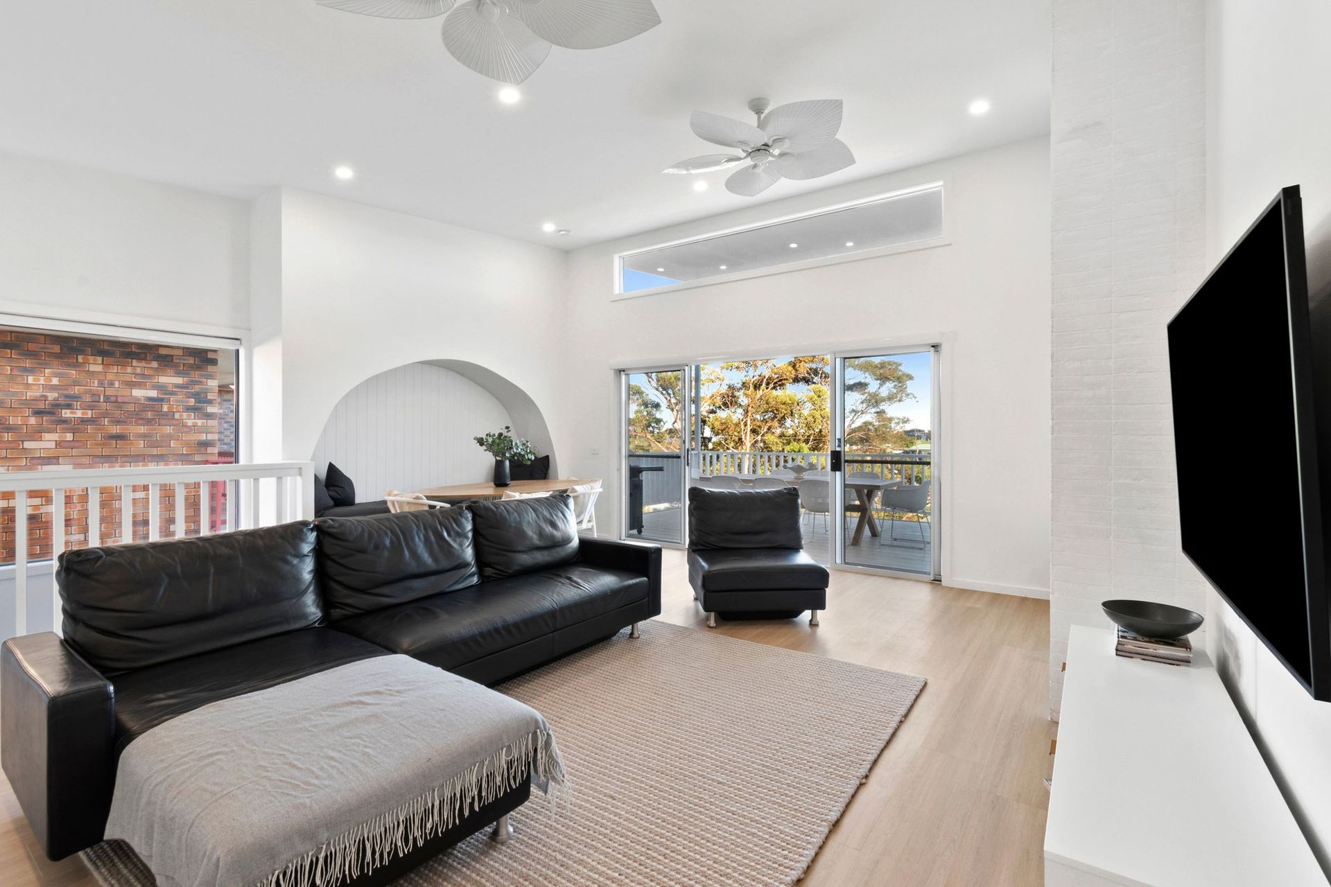Upstairs, the open-plan living area boasts soaring ceilings, a designer chef’s kitchen with butler’s pantry, and elegant banquette dining. The inviting lounge features a built-in electric fireplace, creating a warm and welcoming atmosphere. Glass doors open onto a generous 6.3m sun-drenched deck with a BBQ and alfresco dining setup—ideal for unwinding or entertaining.